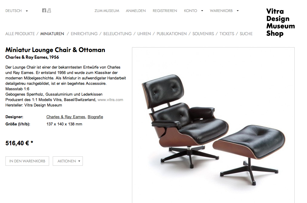 Die Firma Vitra, Möbelherstellerin und Hüterin des verfeinerten Retrogeschmacks, ist anscheinend auch auf dem Gebiet der Masslosigkeit ganz weit vorne. Der Lounge Chair von Eames zum Beispiel ist in drei verschiedenen Grössen erhältlich. Aus gross wird klein wird übergross; ein wahrer Hexensabbat an Wahrnehmungstäuschungen. Die Masse eines Gebrauchsgegenstandes scheinen beliebig veränderbar, sind nicht länger Teil des Entwurfes. Der Gebrauchsgegenstand wird, ohne Nutzungsmöglichkeit, seiner ursprünglichen Bedeutung beraubt. An die Stelle der ursprünglichen Bedeutung setzt die Firma Vitra eine neue, die aber (abgesehen von der Hoffnung auf monetären Gewinn), verschwommen bleibt.