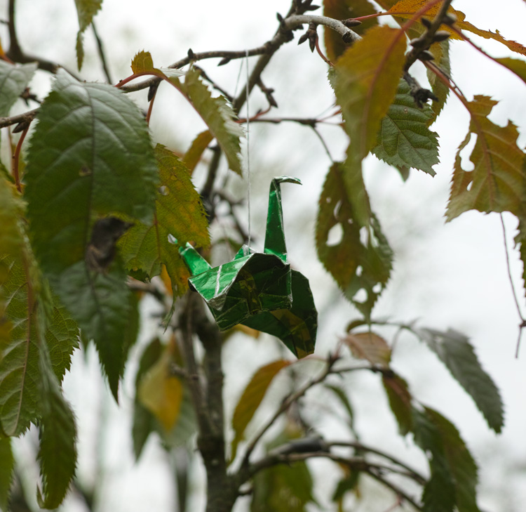 Facing the Japanese Embassy, but standing on the all-embracing, safe side of Tiergarten, there is a new monument. Unofficial, movingly unassuming, and noticed. An insider monument composed by a very young cherry tree, few origami cranes glittering, and a small wooden shield: “Den nie gennannten Kämpfern gegen die Atomenergie in Japan” (“To the never mentioned opposers of nuclear power in Japan”).