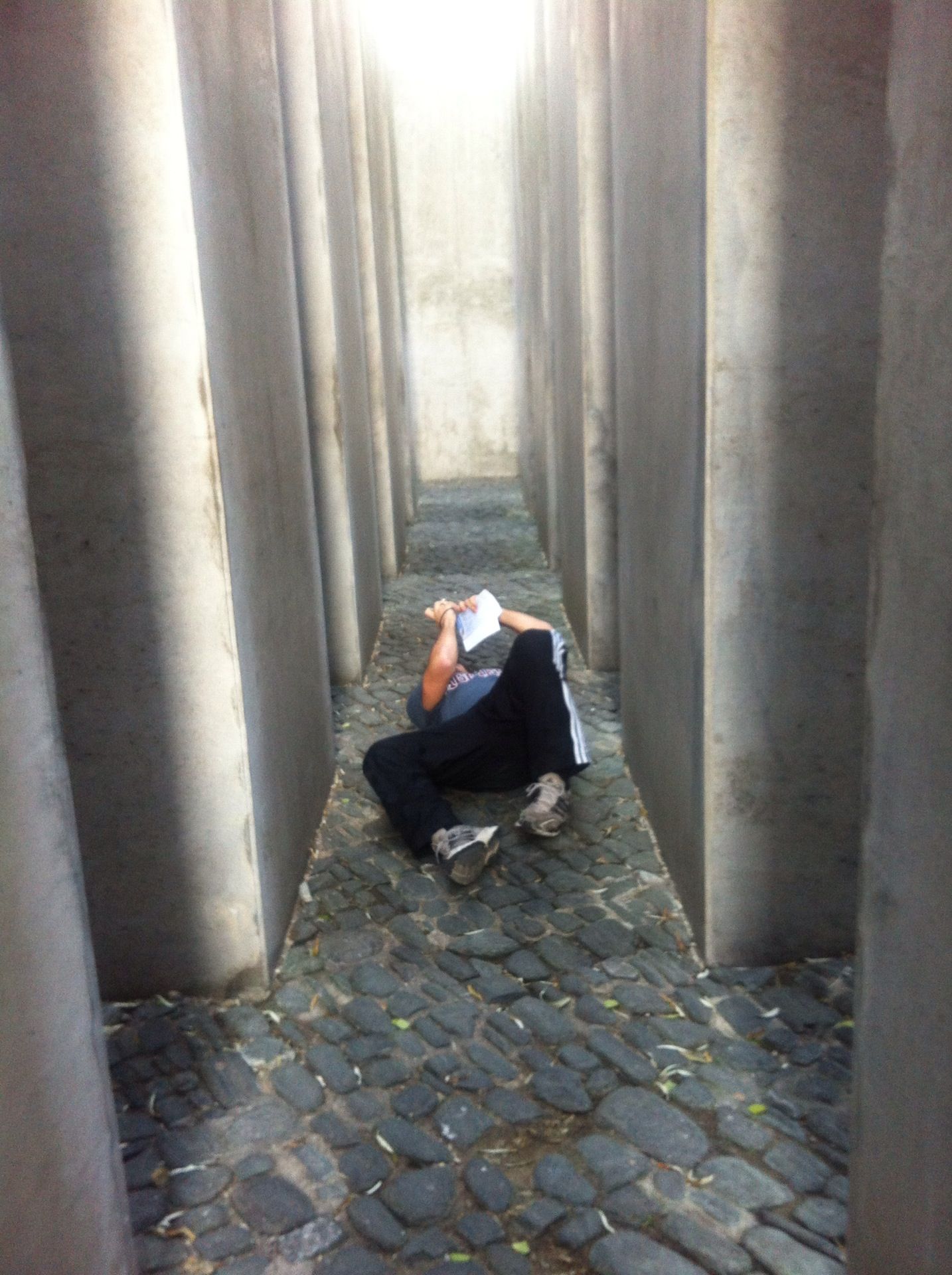 Behold! This is a picture I took of a student of mine taking an abstract aesthetic photo of the sky from the Garden of Exile at the Jewish Museum of Berlin. I took this because I wanted to record how my (American, Texan) students responded to a memorial within a museum that itself is a memorial.