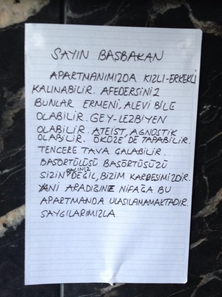 This is a post in a house entrance in Istanbul. The translation is below.