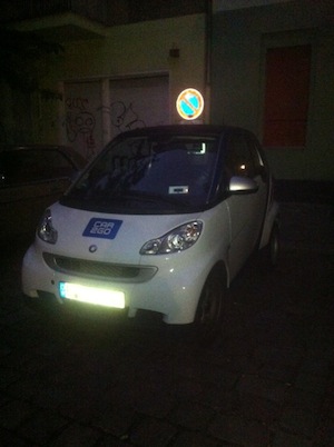 I took a street haphazardly. And there it was. Small, white, beautiful. Car2go, the little car-sharing SMART. At that moment it meant home, security, I was safe.