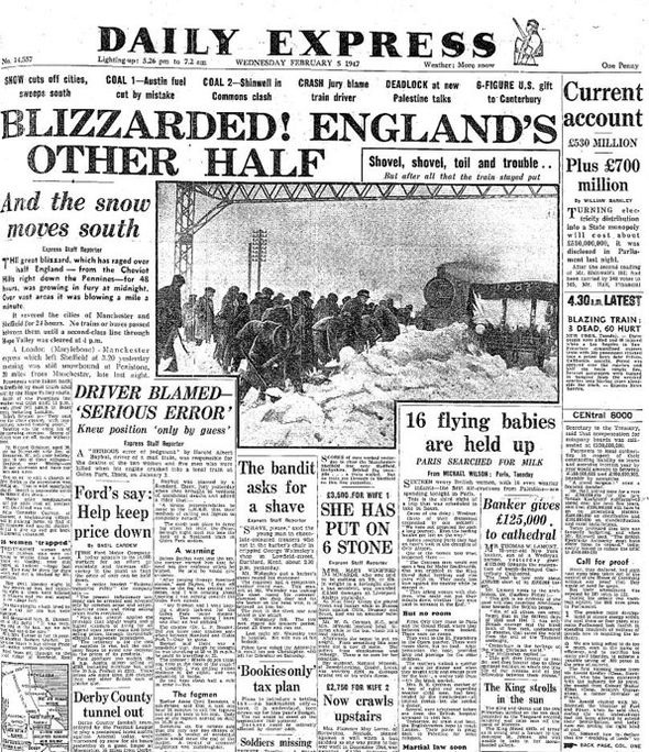Der Beitrag, der die Briten informiert, dass sie sich schon mal auf 100 Tage Schnee in Folge einstellen können, enthält auch die Abbildung einer Zeitungsseite des Daily Express vom 5. Februar 1947. Unter dem dramatischen Aufmacher („Blizzarded!“) finden sich da Meldungen wie „16 flying babies are held up“, „The bandit asks for a shave“, oder – in Versalien – „SHE HAS PUT ON 6 STONE“. Die Briten. Bewahren selbst im schlimmsten Winter die Ruhe.
