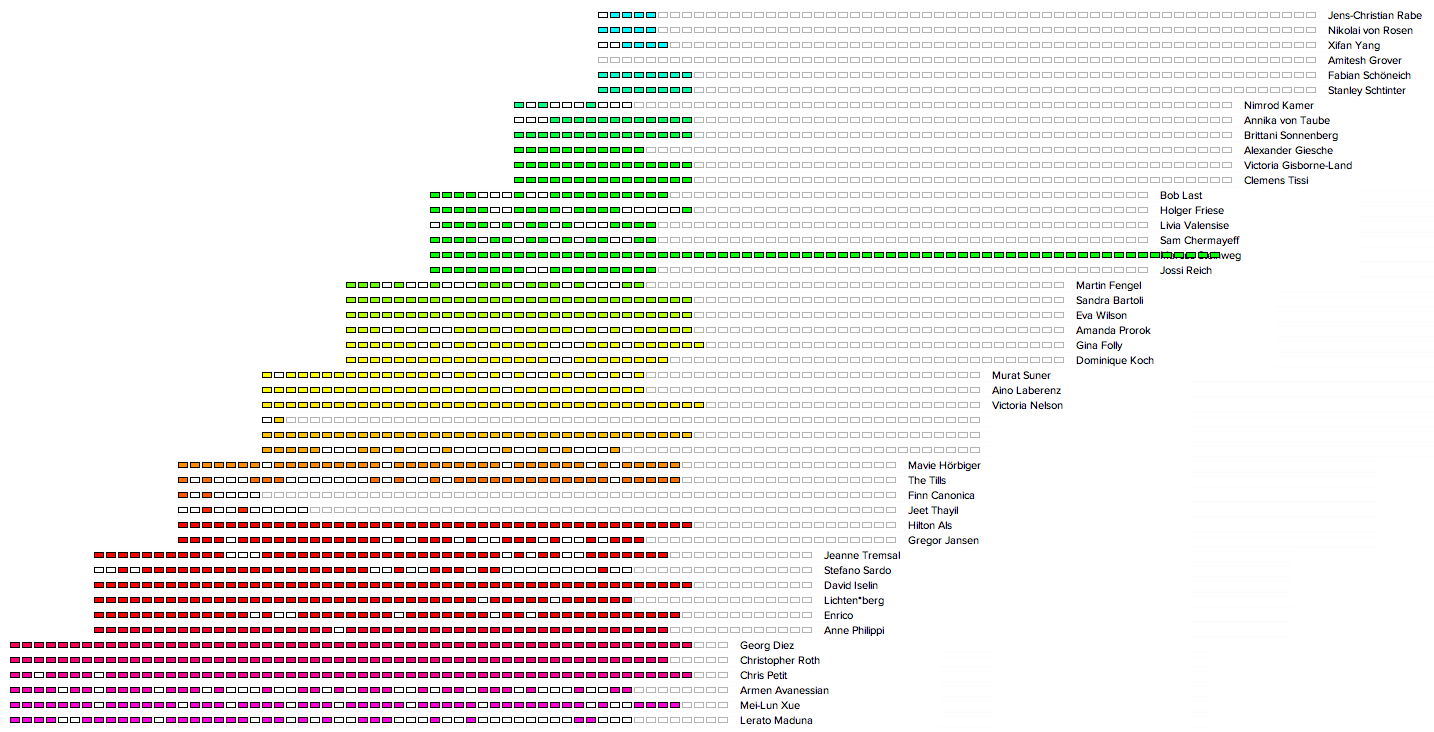 There is happening a nice thing in the archive graphic of 60pages. Marcus’ green line is about to erase his name. What remains is “weg”. One English translation of “weg” could be “off” and I was wondering the last few days, whether Marcus will soon be “off” 60pages? But I’m glad to see that he is still on 60pages… and we can continue to read his new posts, now in blue.