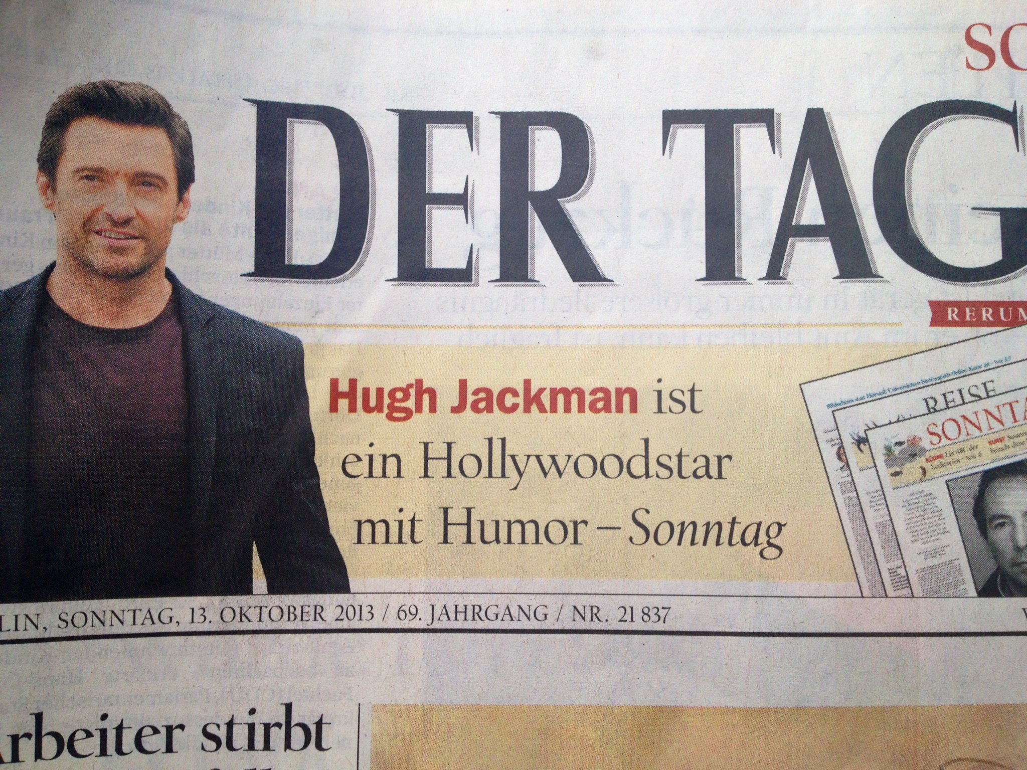 This morning I had a coffee with my friend Daggi, we went to this super coffee place called “The Barn” in Mitte. Basically everyone here seems to be american. It was pleasant and relaxed, a good sign. The city is on a good way and is leaving the “Mauer-times” behind, a good thing. It is time. Four years ago, I thought that wasn’t the case. (Now you even begin to see Brazilians in the subway that are dressed in a Mitte way; huge geek glasses, short hair, red little highlights, black track suits, all that combined with a brazilian body and white teeth, which leaves another impression then the Mitte body, that is hardly worked out.) Back to the café. When we left the place, I saw this headline of TAGESSPIEGEL, “Hugh Jackmann is a Hollywood star with humour”. I took a picture. Who would write a headline like this? The headline is clear, but it could be straight from Adenauer germany. And what does that mean “with humour”. Germany still has this weird idea about Hollywood, it seems, an idea, that belongs to the Fifties. (Like “With Humour”) Hollywood doesn’t operate with with terms like “humour”, “fear”, “joy”, “death”, “life”, way to abstract and simple these days. Also, the headline implies, that nobody else in Hollywood has “humour” and everyone else is basically a bitch and arrogant. German media should catch up with the new world in their headlines, Heinz Rühmann, the old Nazi actor “with humour”, doesn’t exist anymore. New times, new coffee, new americans in town! Please!