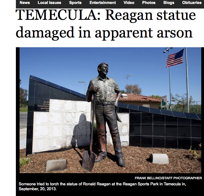 The life-size statue of Ronald Reagan, at his namesake sports park in Temecula, California, was damaged in an apparent arson fire on Friday, Sept. 20. Here are some comments on pe.com: