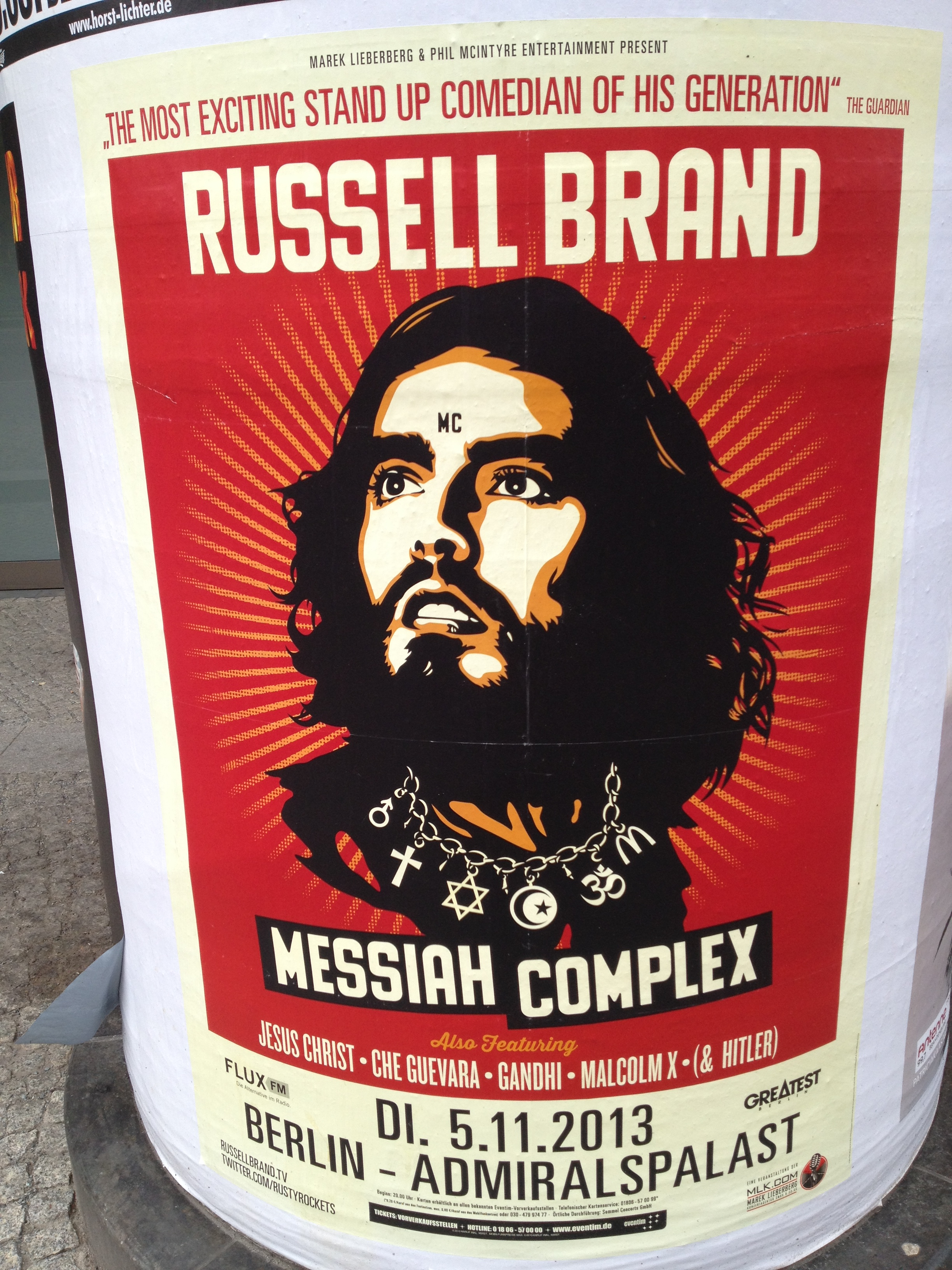 Berliner, I know it sounds strange, but you might want to see this. You will be bored in between, because Russell is too hysterical, too weird and might talk too long. BUT, as we know and remember a couple of weeks ago, the guy has something to say. You should sit front row and observe how someone these days is displaying a messiah complex and how to do that properly. There is no one better to do that. I learned form Russell. Just don’t stop, and keep talking, keep thinking, keep experimenting. You can be sure you will get on peoples nerves, so what? Every time Russell walked into a yoga class that I was in, there was energy in the room. The Russell energy, that comes when you make a fool out of yourself and act like a peacock. Out of that good things will come. I am sure there will be Russell studies one day. But don’t expect a Charlie Sheen on stage, Russell has better legs.