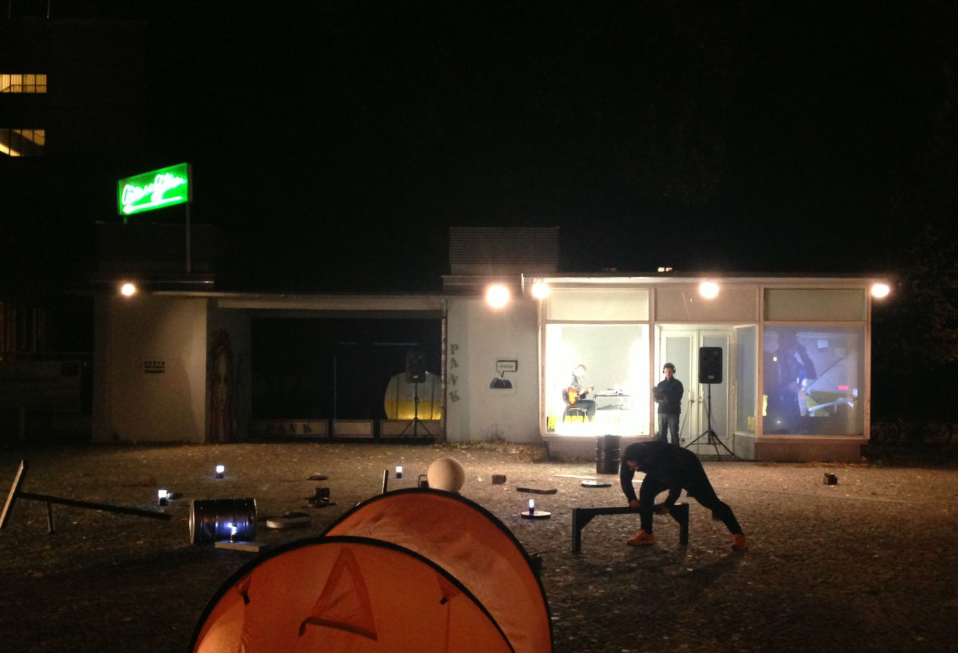 Genau 100 Jahre später kommt in Berlin im Pavillon neben der Volksbühne eine jener Manifestationen künstlerischen Schaffens zur Aufführung, deren Anblick gleichzeitig peinlich und tief berührt. Ein Mann im Pavillon, der Geräusche produziert, mit irgendwelchen Geräten und sich selbst, über das Pflaster verstreute Objekte und Gerätschaften zwischen Endzeit und Surrealismus, als hätten die Kinder von Mad Max und Giorgio di Chirico ihr Spielzeug liegenlassen. Dazwischen turnt ein weiterer Mann eine Choreografie des Scheiterns, ein mit Tongerätschaften ausgestatteter dritter versucht, eine sich offensichtlich aus der Verbindung von statischen Objekten und bewegenden Menschen speisende Soundlandschaft zu füttern.