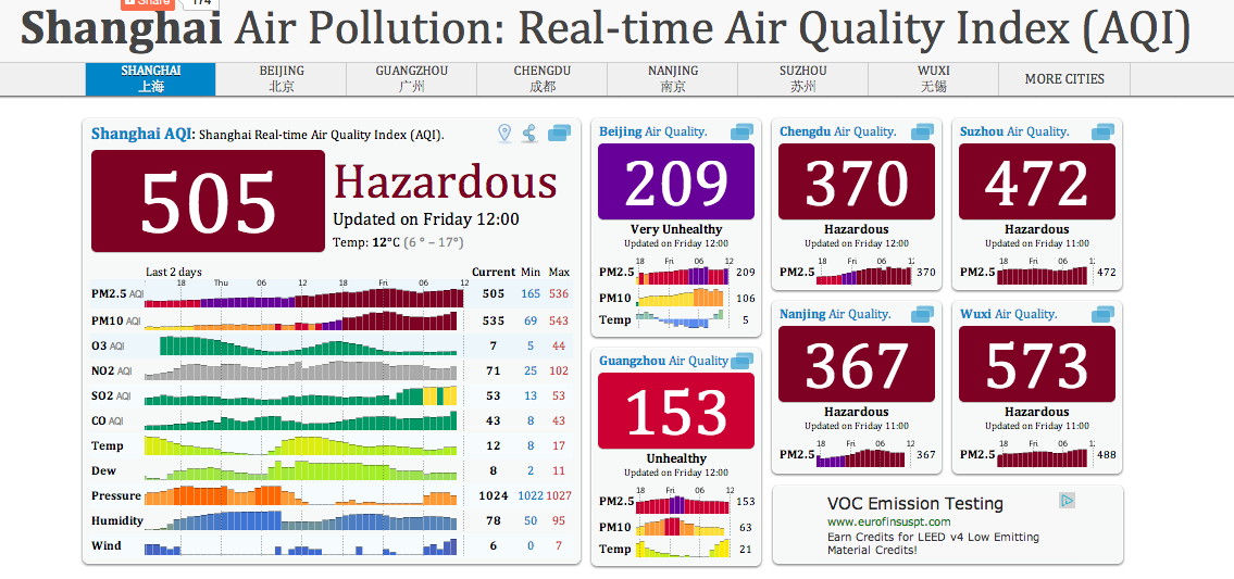 I need to take back what I said the other day – about never wanting to live in smoggy Beijing. For a change, this week I would need go to the capital to breath properly. Right now air pollution in Shanghai has gone off the charts, for the first time in three years that I’ve lived here. The air quality index is at 505 at the moment = “hazardous”. The reason seems to be a lack of wind and low temperatures that make it hard for pollutants to disperse. Beijing only qualifies as “very unhealthy” today at 209 points – still almost ten times polluted as Berlin = 26 points.